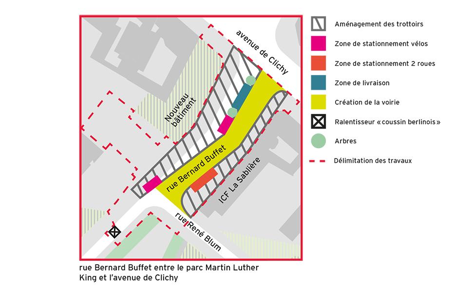 Pour permettre la réalisation des enrobés de la voirie définitive, la portion de la rue Bernard Buffet entre la rue René Blum et l'avenue de Clichy, va être fermée à la circulation les nuits :