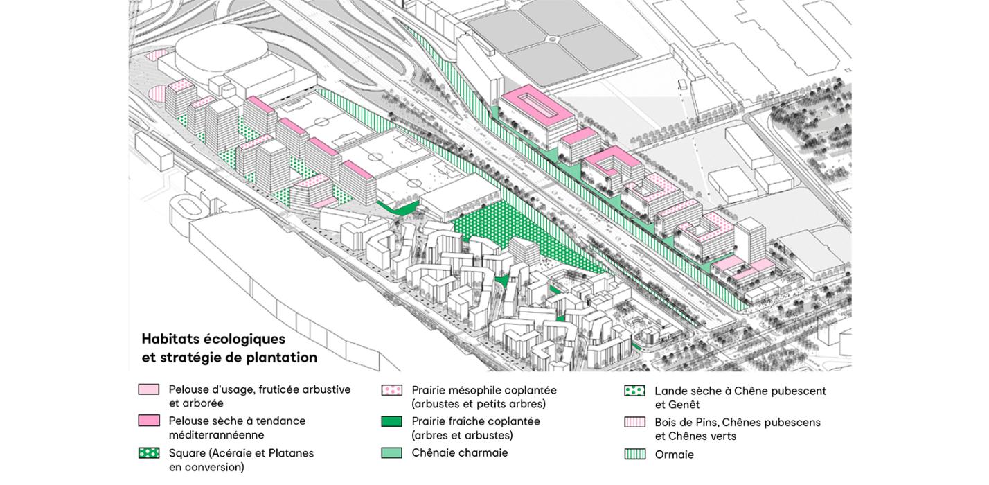 ML. Un bois au sens forestier, c’est 4 hectares, ce que l’on n’a jamais en ville. Mais on peut se donner l’objectif de créer une ambiance forestière. Cela veut dire trois choses : de la fraîcheur, de l’humidité et une certaine lumière au cœur de la masse végétale. Et ça, les études scientifiques nous disent que c’est faisable à partir d’un demi-hectare. C’est ce que nous allons faire avec le corridor boisé du projet Gare des Mines.