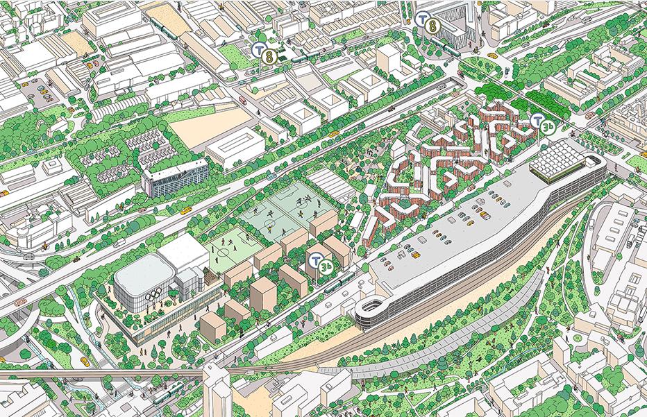 Inscrit dans une armature paysagère qui participe à la résilience du territoire, le projet Gare des Mines-Fillettes comprend environ 150 000 m² de surface de plancher répartis de la manière suivante :