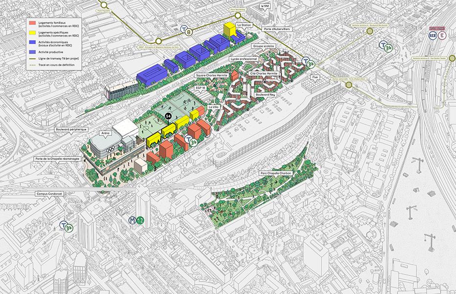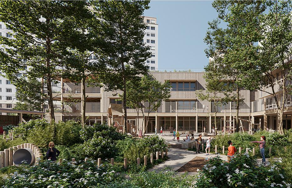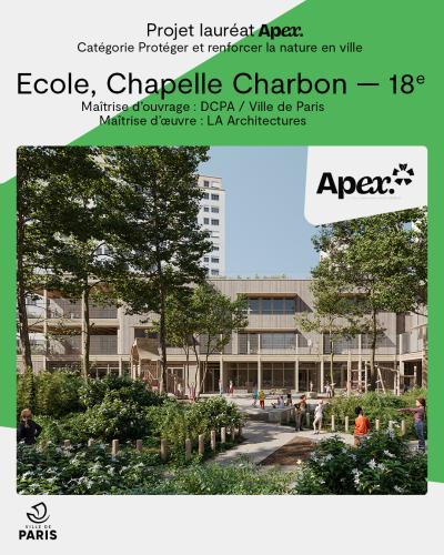 Il accueillera le nouveau groupe scolaire de 12 classes et prolongera le parc Chapelle Charbon grâce à une cour oasis végétalisée, favorisant le bien-être des enfants et la fraîcheur en été. Sa toiture en terrasse sera dédiée à l’agriculture urbaine.