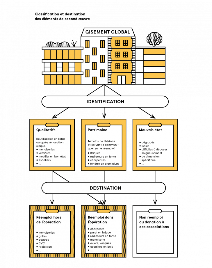 Plusieurs moyens sont disponibles pour économiser les ressources en matériaux et réduire les déchets. La première consiste à conserver des bâtiments plutôt que les démolir. La seconde passe par le réemploi ou la réutilisation des terres, des matériaux de démolition ou de certains matériels que l’on récupère dans les bâtiments à déconstruire sur le site des opérations d’aménagement. Une troisième forme de réemploi consiste à introduire dans les projets des ressources de seconde main venues d’ailleurs. Ces différentes modalités impliquent des méthodologies particulières, que P&Ma a notamment mises en place sur les opérations Chapelle Charbon et Saint-Vincent-de-Paul.