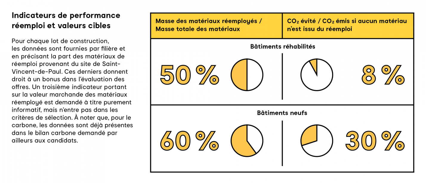 À Saint-Vincent-de-Paul, 60% des bâtiments (en surface) seront conservés, ce qui constitue la première et principale forme de réemploi. Les autres sont déconstruits de manière à permettre le réemploi de matières sur place (de préférence) ou ailleurs. Pour les constructions neuves comme pour les réhabilitations, les opérateurs sont tenus de démontrer la part de réemploi dès la conception de leur projet.