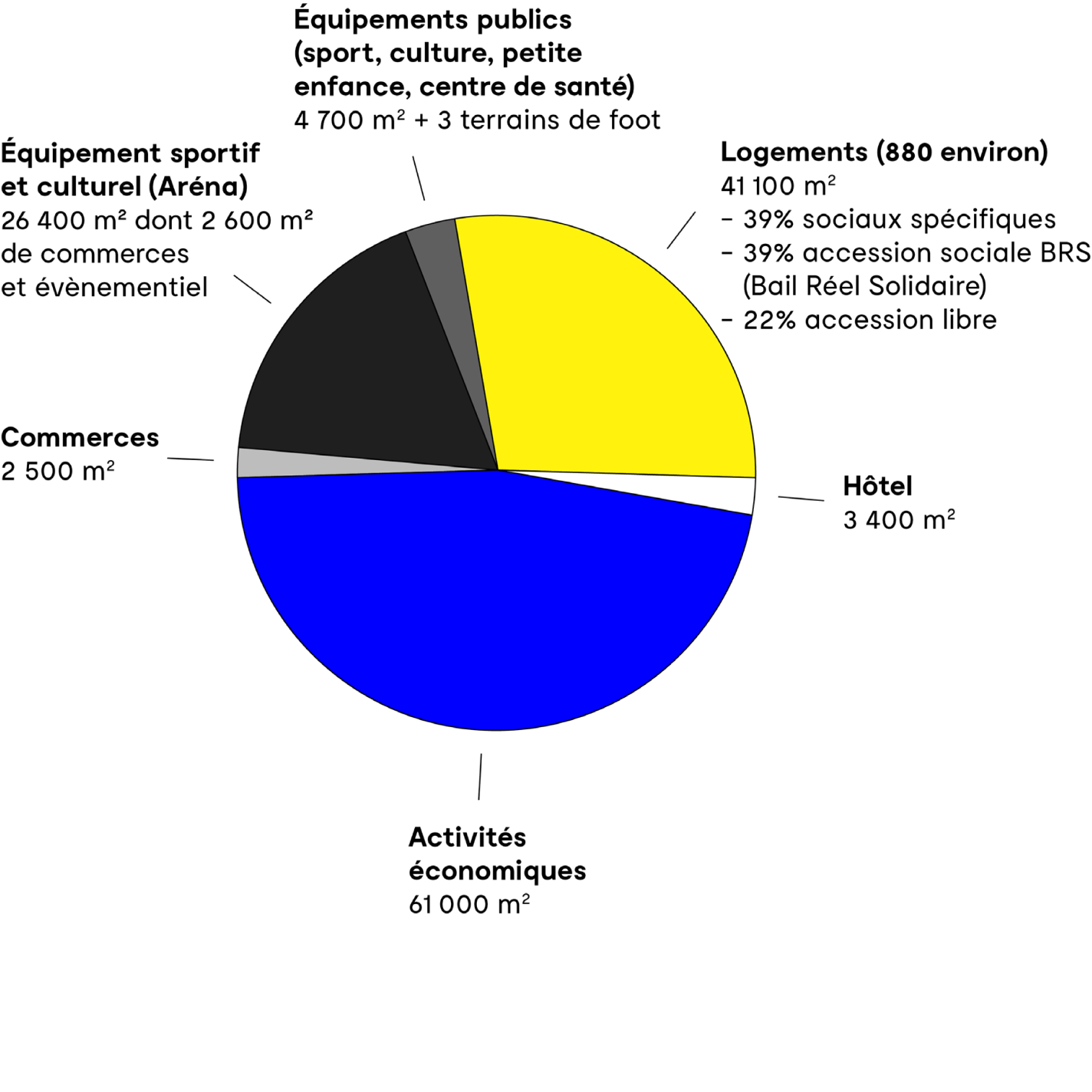 | Equipements publics : sport, petite enfance, centre de santé et culture | 4 700 m² + 3 terrains de sport |