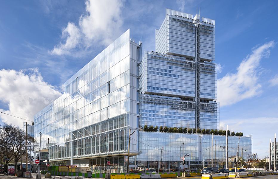 Résultat d'une prouesse technique, ce prisme triangulaire de huit étages avec sous-sol, enjambe le tunnel de la ligne 13 du métro et surplombe les nouveaux ouvrages réalisés par la RAPT pour la ligne 14, dont le prolongement sera mis en service lundi 14 décembre 2020.
