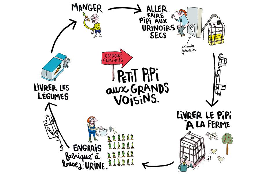 L’expérience a démarré ce mois-ci et se prolongera jusqu’au terme de l’occupation temporaire des Grands Voisins, dans une année environ. Elle préfigure la généralisation à l’ensemble du futur quartier Saint-Vincent-de-Paul d’un dispositif de collecte des urines pour hommes et femmes.