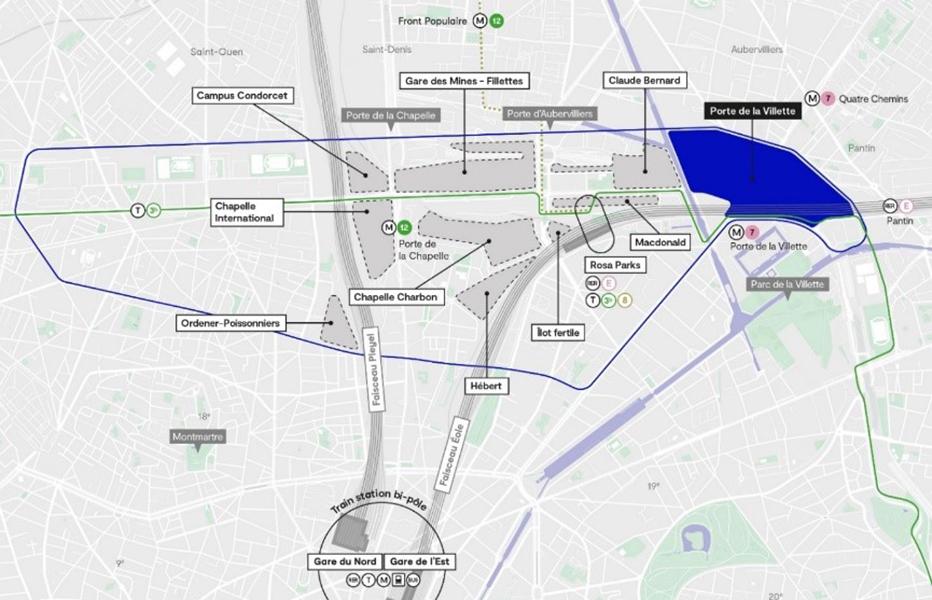 Située au nord-est du XIXe arrondissement, la Porte de la Villette est un secteur stratégique de la capitale, à l’articulation entre Paris, Pantin et Aubervilliers, à proximité du canal de l’Ourcq et du parc de la Villette. Ce vaste site morcelé est traversé d’infrastructures majeures en particulier le faisceau ferroviaire de la Gare de l’Est et le boulevard périphérique appelé à muter progressivement en boulevard urbain apaisé. Il accueille aujourd’hui des locaux de la Préfecture de Police, des ateliers de la RATP et des activités évènementielles, festives et solidaires avec en particulier le plus grand centre parisien de distribution alimentaire.