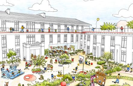 Une cour végétalisée dédiée aux enfants pendant les temps scolaires © Diane Berg