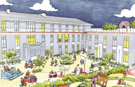 Une cour mutualisée avec les habitants du quartier, espace de rencontre et d'animation © Diane Berg