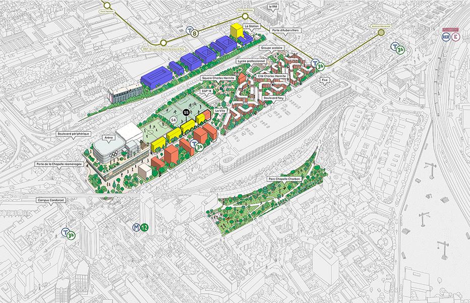 Le programme est implanté sur une emprise contrainte de 100 mètres de long sur 13 mètres de profondeur, au sud de l’opération, le long de la promenade plantée qui reliera la Porte de la Chapelle à la future place Charles Hermite. Il jouxte le lot S4 (logements spécifiques au-dessus d’un nouveau gymnase axé sur la boxe, le judo et la danse) dont le projet d’architecture a été retenu au mois de mars 2025.