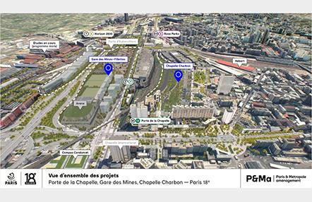 Jeudi 29 juin 2023, les adjoints à la maire de Paris, Emmanuel Grégoire, Anne-Claire Boux, Ian Brossat, Jacques Baudrier, le maire du 18e arrondissement Eric Lejoindre et la directrice générale de P&Ma, Sylvie Borst ont présenté à la presse les ambitions du projet Chapelle Charbon dont la conception architecturale et paysagère est quasiment achevée.