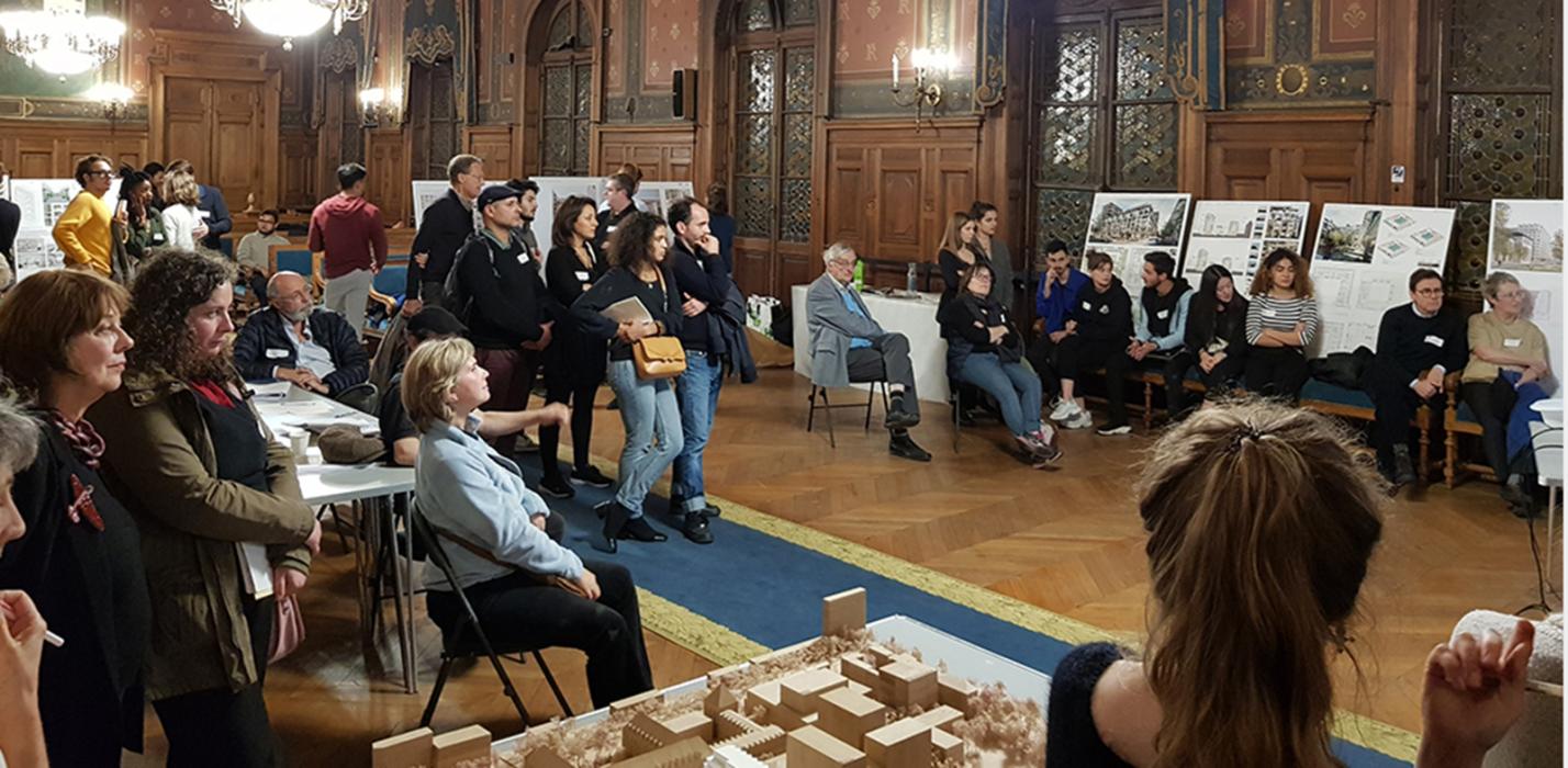 L’atelier « d’analyse » a lieu quelques jours plus tard. Il a pour préoccupations essentielles de dégager une synthèse qui intègre la diversité des points de vue. L’objectif est de produire un avis sur chacun des projets en lice, et non de classer les projets dans une logique comparative. Nous constituons donc, pour chaque îlot, un groupe de travail par projet concurrent. Il est lui-même divisé en sous-groupes thématiques : programmation, performance environnementale, architecture, logement et espaces communs…Au milieu de la séance d’analyse, l’ensemble des participants à l’atelier se retrouve pour découvrir brièvement les projets en lice avant de se séparer une nouvelle fois pour formuler les dernières observations et rédiger la note conclusive, base des avis citoyens.