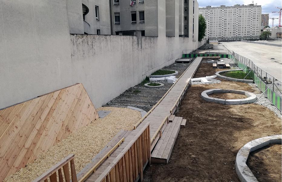 En surplomb du chantier du futur grand parc public de Paris Nord-Est (6,5 ha à terme), un belvédère permet de suivre les travaux menés par la Direction de l'Environnement et des Espaces Verts de la Ville de Paris (DEVE).