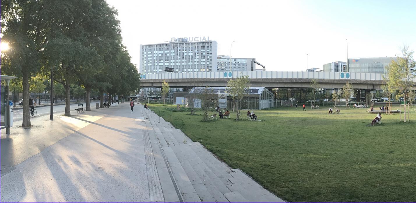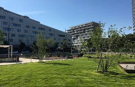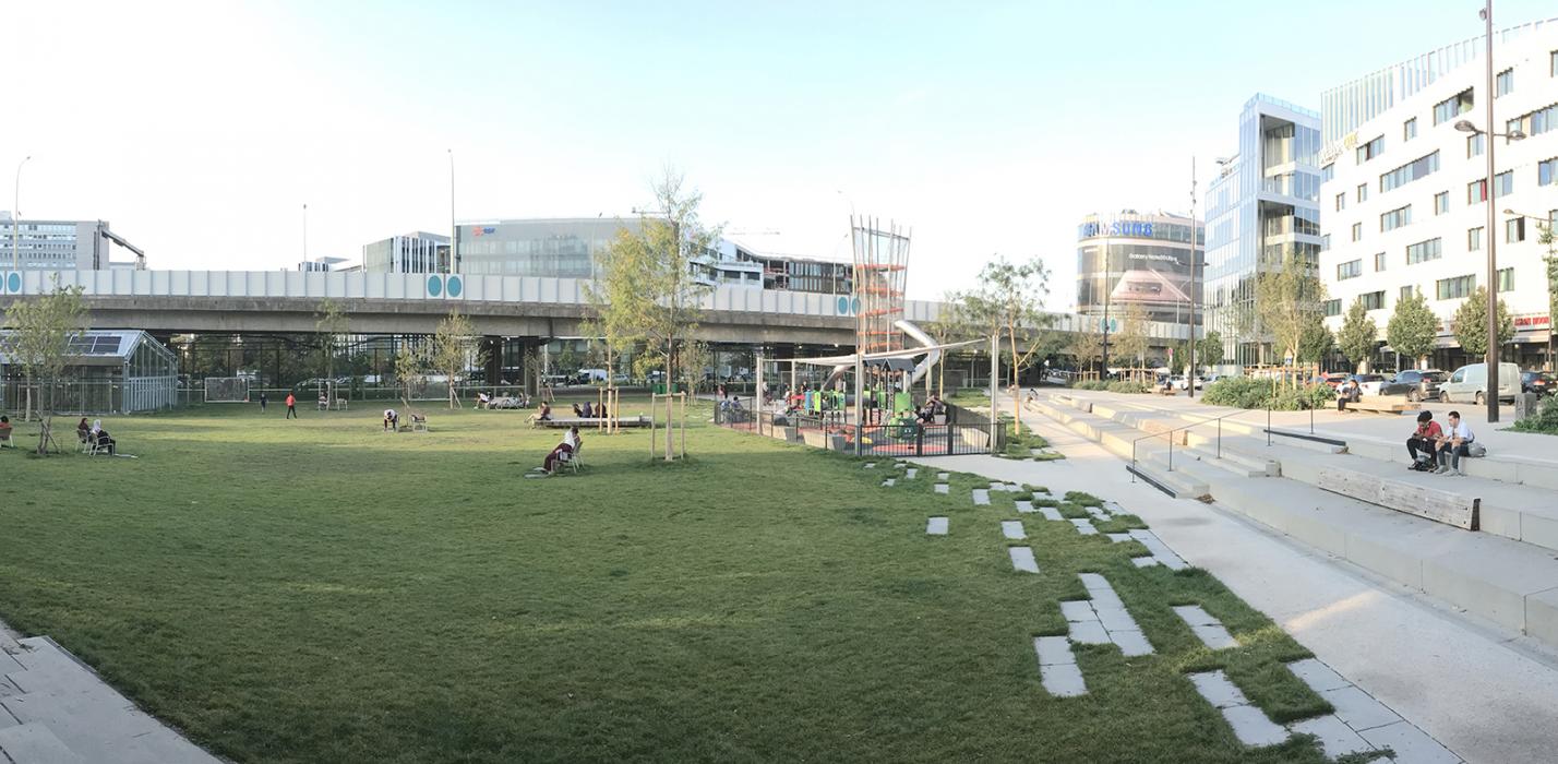 => une vaste pelouse récréative accueillant des jeux pour enfants sur mesure ainsi qu’un centre social prend place le long du boulevard du Bois le Prêtre et de la rue Hélène et François Missoffe