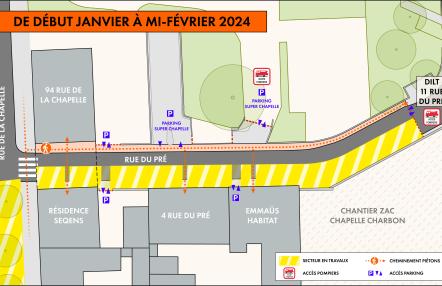La fermeture complète de la rue du Pré à la circulation véhicules est prévue du 8 février à partir de 22h au 9 février 2024 à 6h. Aucune entrée / sortie véhicule ne sera possible pendant ce créneau. Circulation piétonnière maintenue.
