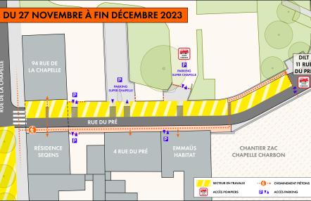 Les travaux démarrent le 27 novembre 2023 pour une durée d’environ trois mois dans la rue du Pré. Ils continueront ensuite à l’arrière des palissades pour permettre un accès piétonnier au parc Chapelle Charbon dont l’ouverture au public est prévue en avril 2024.