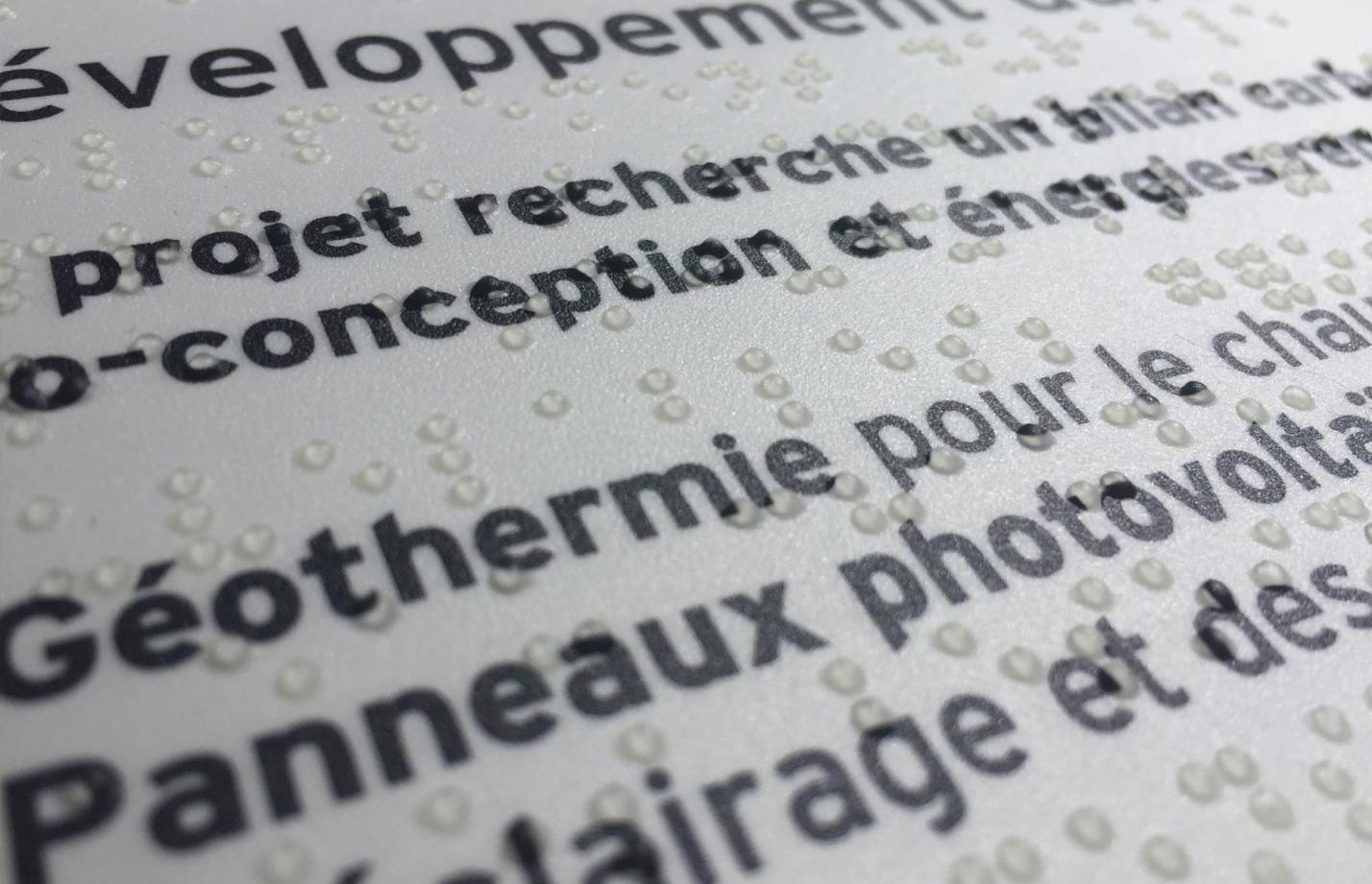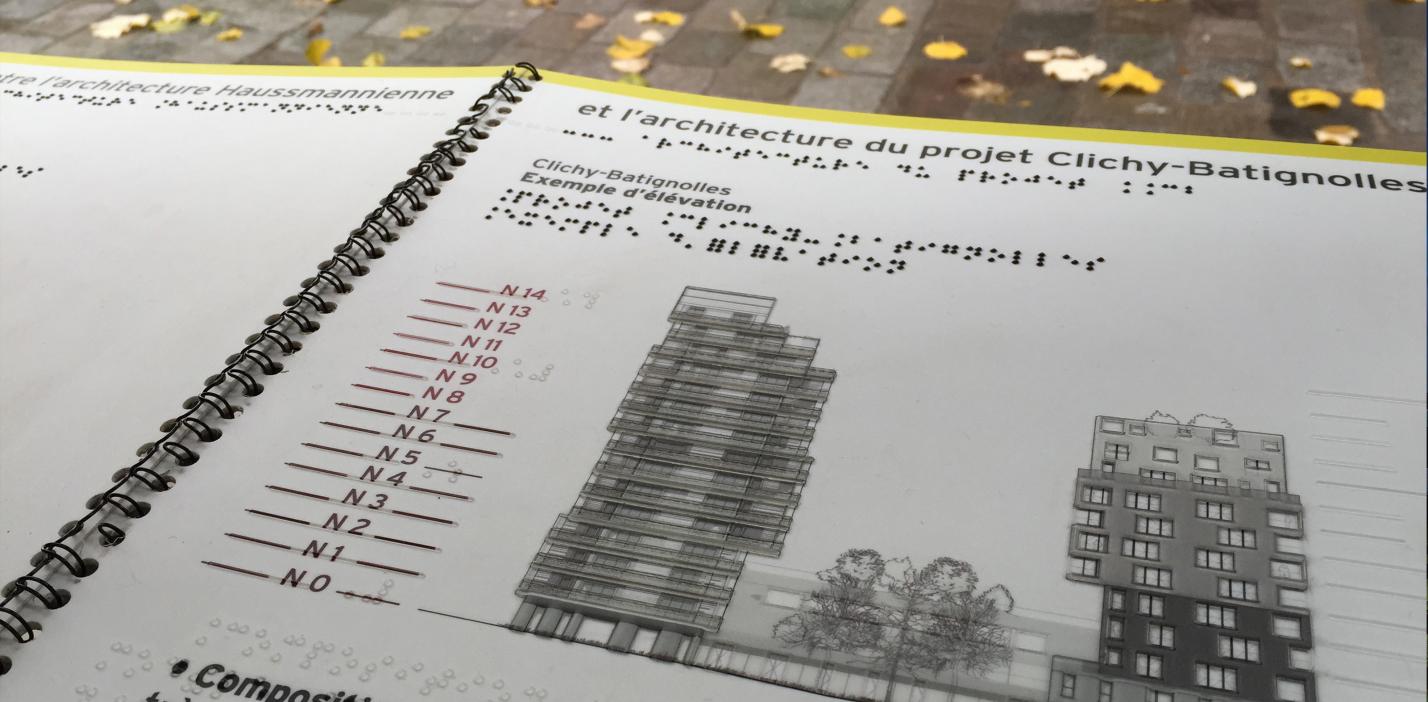 Supports conçus par la direction de la communication de Paris & Métropole aménagement et réalisés avec L’Iliade du Patrimoine, association spécialisée en accessibilité / Hoëlle Corvest-Morel, spécialiste en accessibilité culturelle et en graphisme tactile, chargée de l’accessibilité au public handicapé visuel à Universcience jusqu’en 2016 / Studio APA-Création, graphisme visible et tactile, Imprimerie Laville, impression braille.
