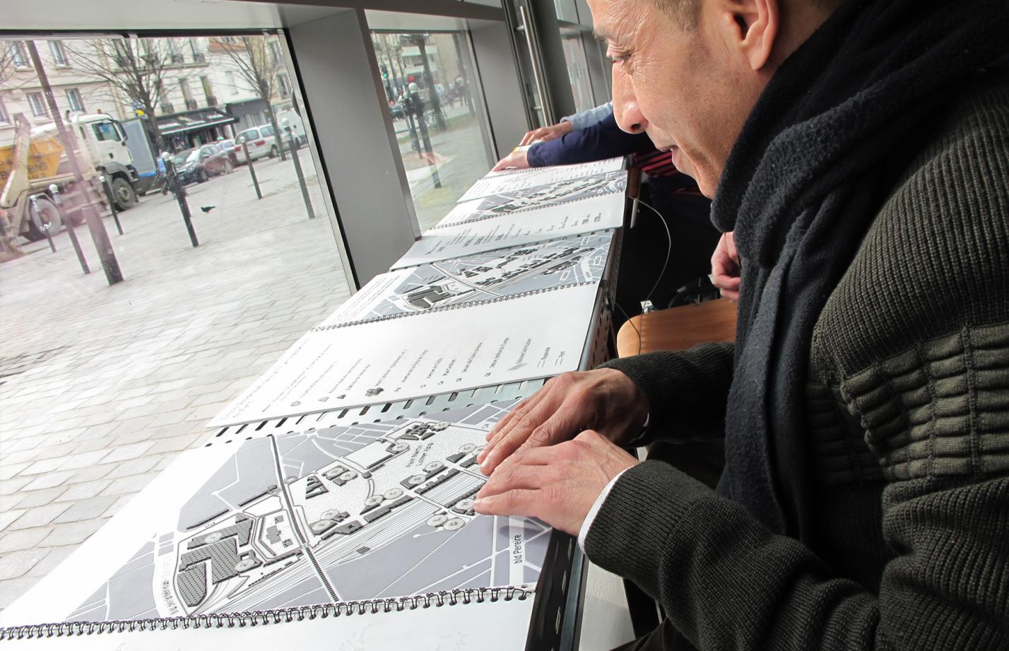 Les plans aux coloris contrastés et en relief et les textes en gros caractères transcrits en braille ont été réalisés avec des spécialistes1 et testés par des non-voyants. Les variations de reliefs et de trames de la résine offrent une large gamme de sensations tactiles, qui permet l’accès à une grande complexité d’information. Par-delà les scolaires malvoyants avec lesquels nous avons engagé des ateliers pédagogiques, ces supports qui superposent du visible et du tactile proposent une lecture très synthétique du projet, appropriable par un large public. Cette démarche nous a mis en relation avec de nombreuses personnes handicapées visuelles dont la principale demande, vis-à-vis de l’aménageur que nous sommes, réside dans l’adaptation des espaces à leur handicap.